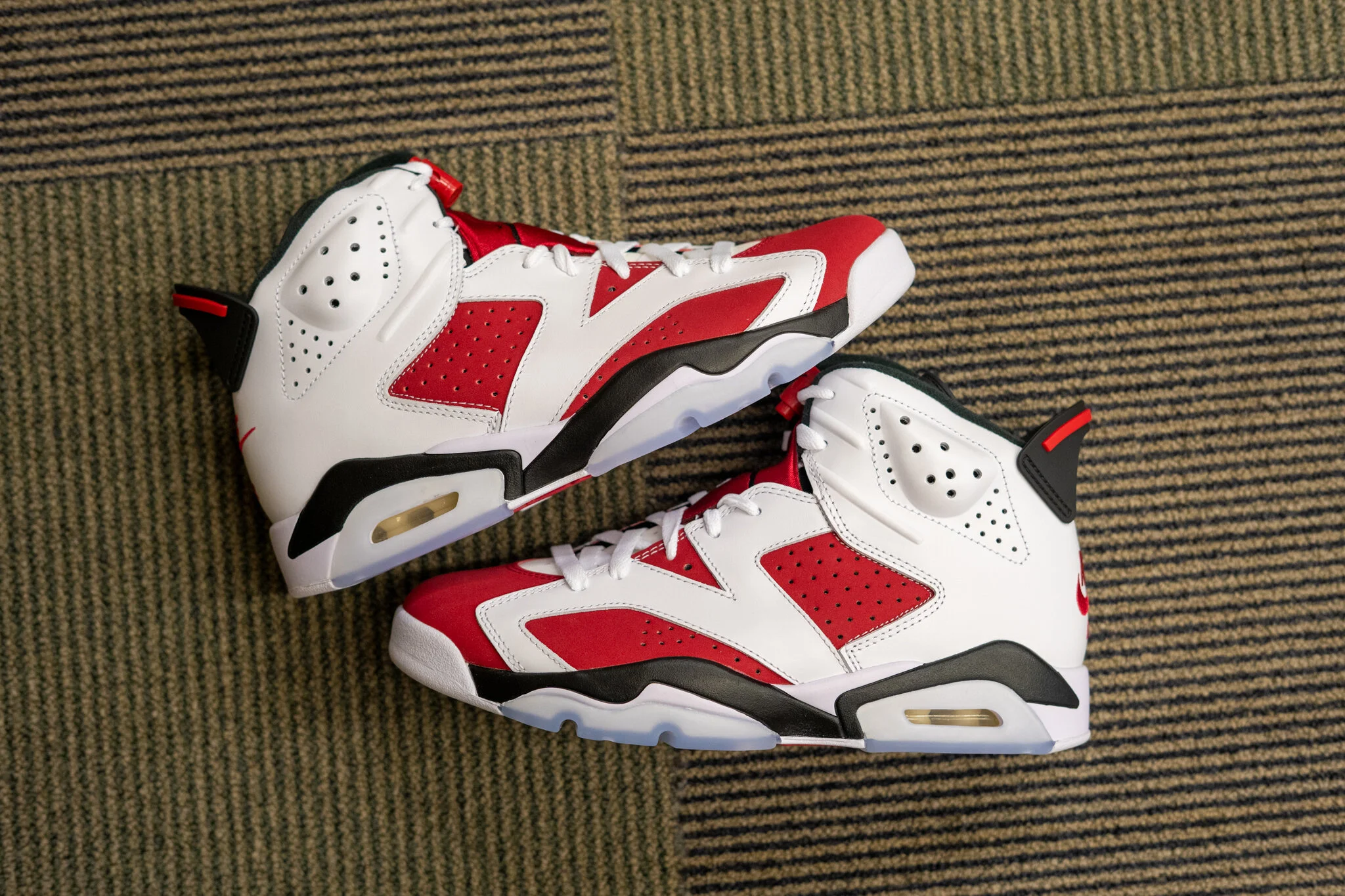 The Air Jordan 6 Carmine combines red, white, and black colors to represent the Chicago Bulls’ signature colors. The upper features bold red and white colors that help the model pop while on foot. From there, the upper is met with a white and black midsole, with hits of an icy blue outsole appear as well. The final touch to this OG’s return is the signature “Nike Air” on the heel, replacing 2008 and 2012 retros’ “Jumpman” logo.